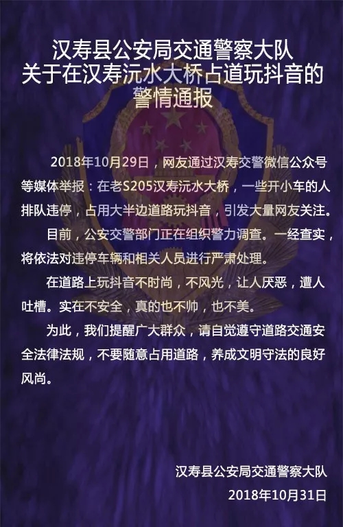 中新网10月31日电 湖南常德汉寿县交警官方微信31日发布警情通报,称接到举报有一些开小车的驾驶员,在汉寿县沅水大桥排队违停,占用道路拍抖音。接报后警方已组织调查,查实将严肃处理,同时呼吁遵守道路交通安全法律法规。
