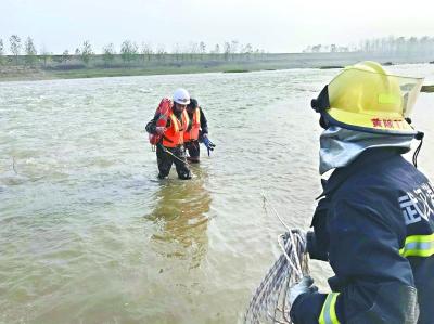 在与被困者沟通后,现场消防指战员决定由一名经验丰富的消防员携带救生器材徒步涉水营救被困人员。救援人员在仔细观察完地形,利用救生绳、救生衣等救援装备做好个人防护后,跳入冰冷的河水中,采取探步前进的方法在湍急的河流中一步一步地寻找安全的救生通道。此时,救援中河水深处已超过1.2米。