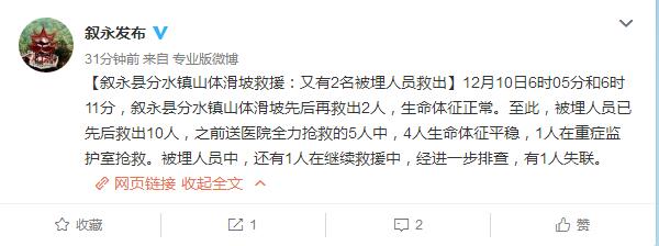 据四川省泸州市叙永县人民政府新闻办公室官方微博消息:12月10日6时05分和6时11分,叙永县分水镇山体滑坡先后再救出2人,生命体征正常。至此,被埋人员已先后救出10人。