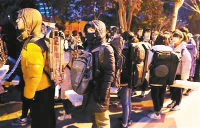 考生们天未亮就赶到考点排队,等待进入考场。