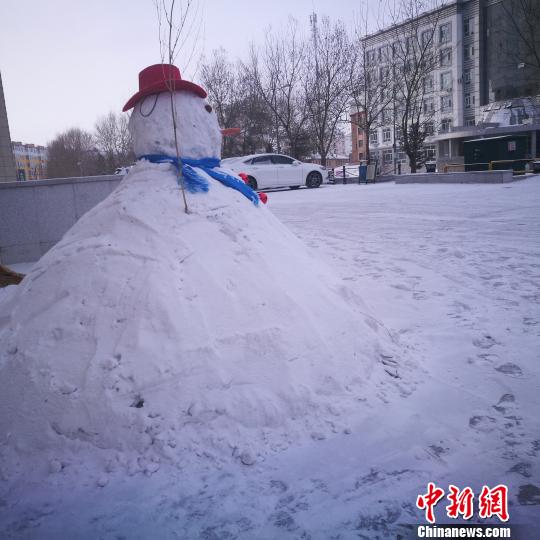 呼伦贝尔降雪民众堆雪人。 李爱平 摄