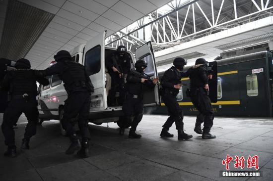 资料图:铁路特警在火车站内进行应急处突训练。 陈超 摄