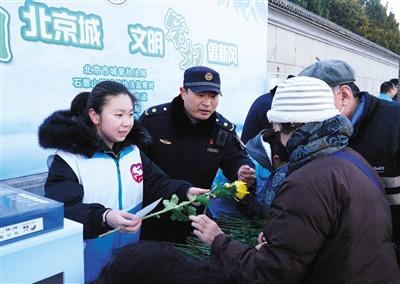 3月30日,八宝山公墓西门外,城管执法队员和志愿者开展宣传活动,鼓励市民选择“鲜花换冥币”等文明祭扫方式。北京市城管执法局供图