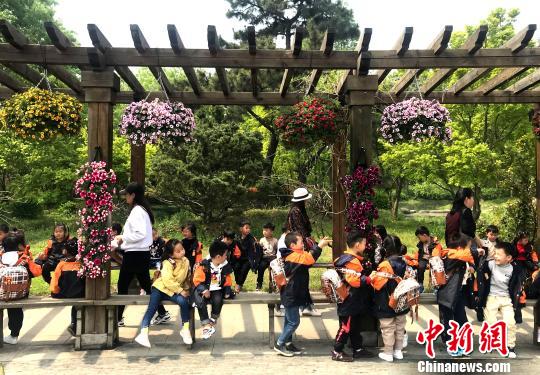 图为一群小朋友在万花园赏花游玩。 崔佳明 摄