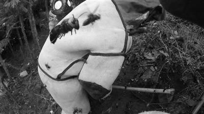 “群蜂撞向我们时,声音很大,我们之间互相讲话都听不到。”刘定茂说,即使戴着面罩,眼睛也不能向上看,因为虎头蜂会往面罩上扑,喷射蜂毒。那次,他们一靠近蜂巢,上千只工作蜂扑面而来。平时负责筑巢、觅食、喂养幼虫的工作蜂,一旦蜂巢受到侵犯,它们会奋起御敌。在挖蜂巢时,刘定茂的眼睛被蜂毒喷溅到,眼泪直流,不得不退出现场用清水冲洗,好在蜂毒没有进入血液。但那次一名姓蒋的工人因没有穿戴连体防蜂衣被蜇伤,紧急送医治疗住院两天才好转。