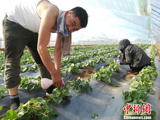 在一棚棚孕育着希望的绿色甜瓜苗中,“85后”合作社负责人王涛正在给瓜苗授粉。