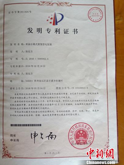 中新网贵州石阡4月23日电(通讯员 杨毅 刘进 黄蓉)贵州省铜仁市石阡县甘溪乡一农民张远方花费6年多的心血,投入近500万元(人民币,下同)研发出、能做出“甑子饭”的电饭锅,最终获得成功并拿到了国家发明专利。