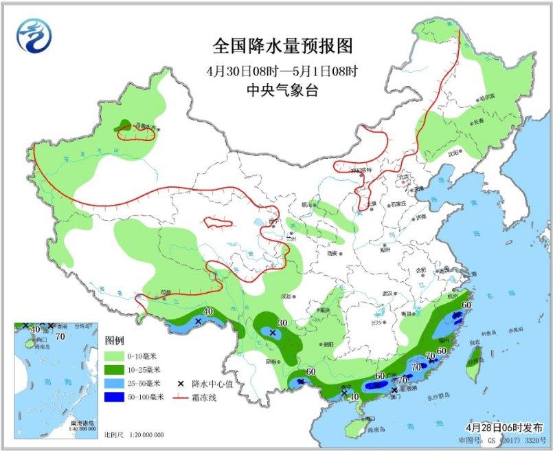 图1 全国降水量预报图(4月28日08时-29日08时)