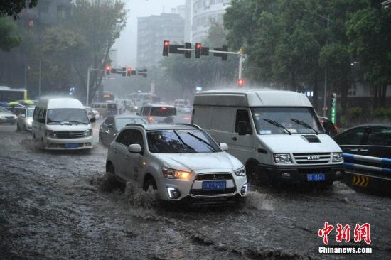 资料图:暴雨袭击重庆主城区,不少车辆缓慢通过积水路段。陈超 摄