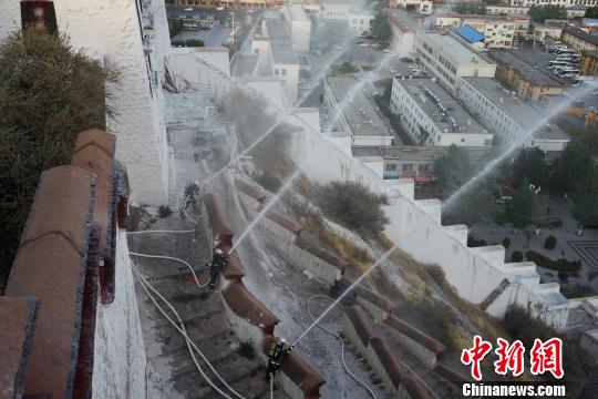图为5月7日,拉萨消防救援指战员在世界文化遗产布达拉宫进行了一场文物古建筑火灾扑救实战演练。 张伟 摄