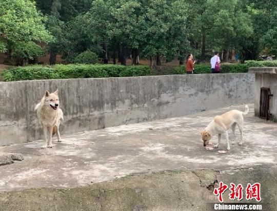 记者8日来到九峰森林动物园看到,狼舍中除了一头公狼外,确实还有一只体型稍小的土狗。狼和狗时而追赶玩耍,时而相互舔毛,没有看到双方撕打、抢食等现象。