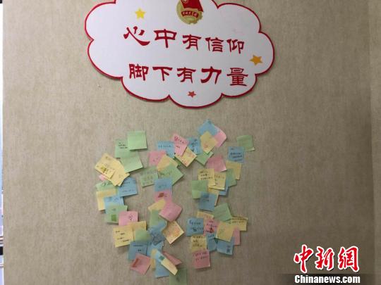四川师范大学“公益屋”墙壁上粘贴着写有同学们留言与祝福的便签纸。 贺劭清 摄