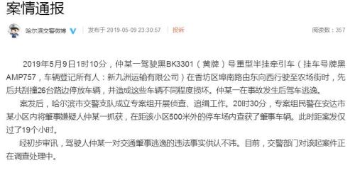 中新网5月10日电 据哈尔滨市公安交通管理局微博消息,2019年5月9日1时10分,仲某一驾驶黑BK3301(黄牌)号重型半挂牵引车(挂车号牌黑AMP757,车辆登记所有人:新九洲运输有限公司)在香坊区埠南路由东向西行驶至农场街时,先后共刮撞26台路边停放车辆,并造成这些车辆不同程度损坏。仲某一在事故发生后驾车逃逸。