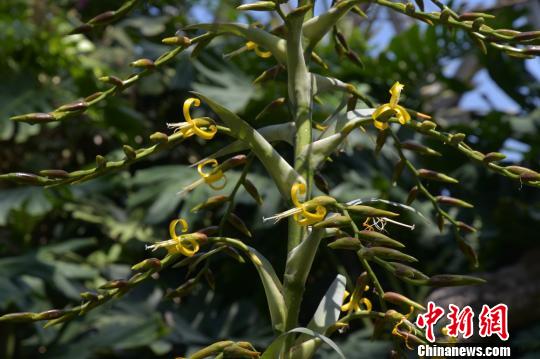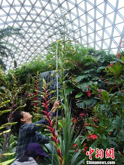 中新网上海5月30日电 (陈静 张哲)香花卷瓣凤梨是巴西特有的一种体型巨大的凤梨科植物,上海辰山植物园30日披露,该园热带花果馆内一棵清秀挺拔的香花卷瓣凤梨,在工作人员精心养护下抽序、开花,其花序长度达3.05米,超过史上文字记载最长长度。