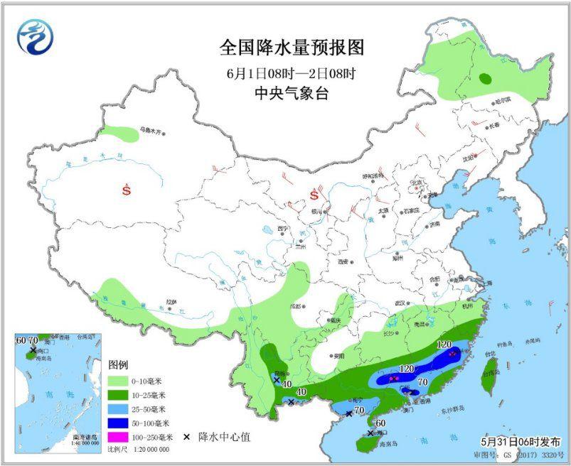 6月1日08时至2日08时,江南南部、云南东南部和中部、华南、台湾岛等地部分地区有中到大雨,其中,江西南部、福建中西部、广西东北部、广东中部和北部等地局地有暴雨或大暴雨(100~120毫米)。内蒙古大部、东北地区中南部、甘肃河西、陕西北部、山西北部等地部分地区有4~6级风(见图2)。