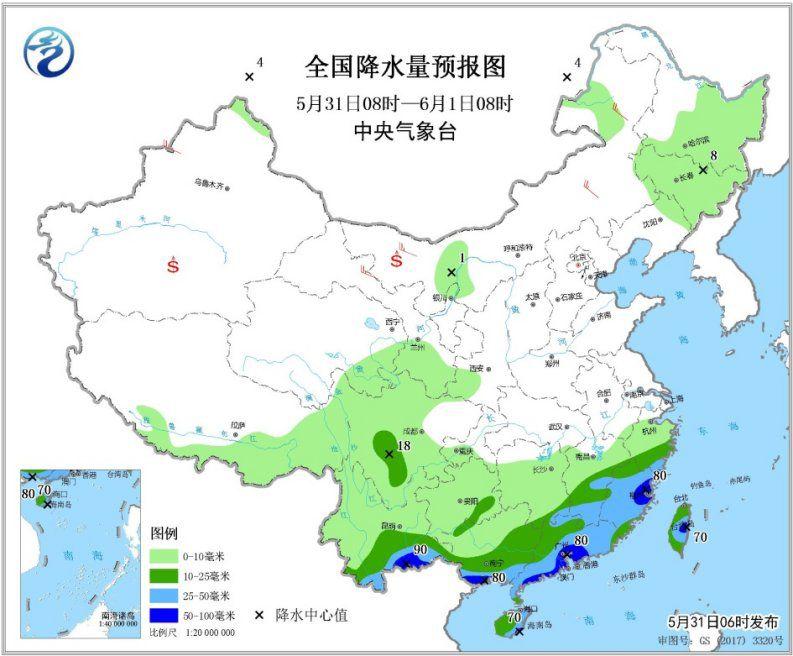 5月31日08时至6月1日08时,江南南部、华南、云南中南部、川西高原南部等地的部分地区有中到大雨,其中,云南南部、广西南部、广东南部、福建东北部、海南岛东部、台湾岛东部等地的局部地区有暴雨(50~80毫米)。上述地区并伴有雷暴大风、短时强降水等强对流天气。内蒙古西部和中东部、甘肃西部等地有4~6级风(见图1)。