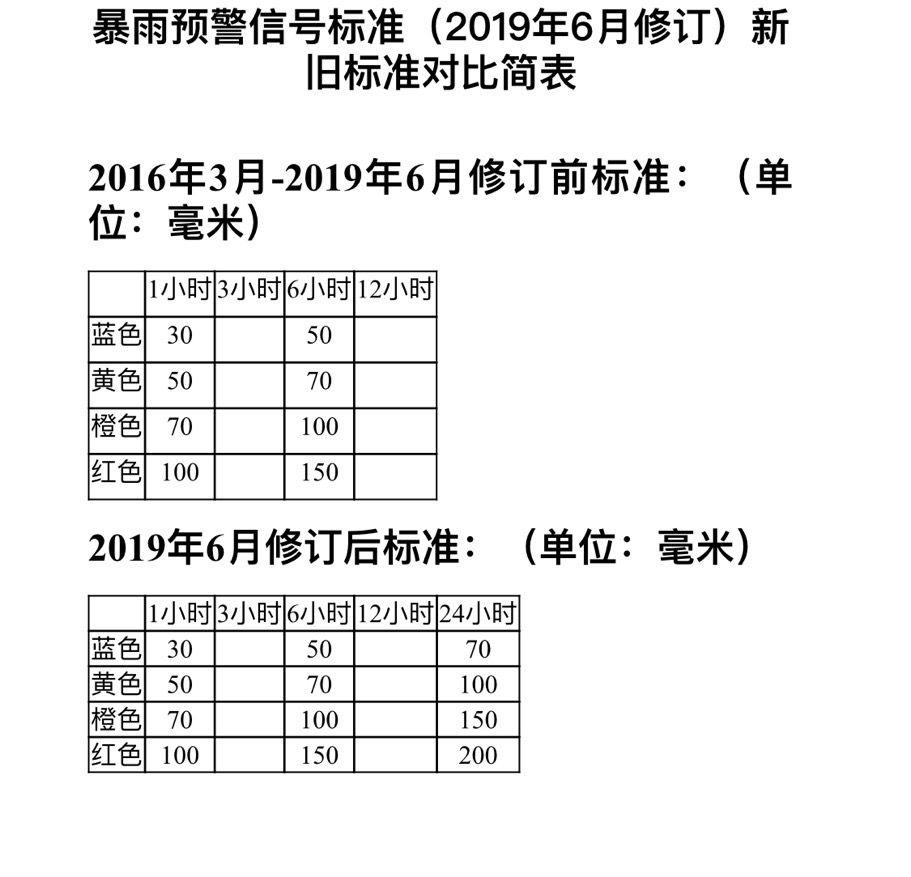 新标准仍为蓝色、黄色、橙色、红色四级预警,较此前2016年修订后设定的雨强(1小时降雨量)标准和过程雨量标准(6小时降雨量)基础上,新增24小时暴雨预警阈值。
