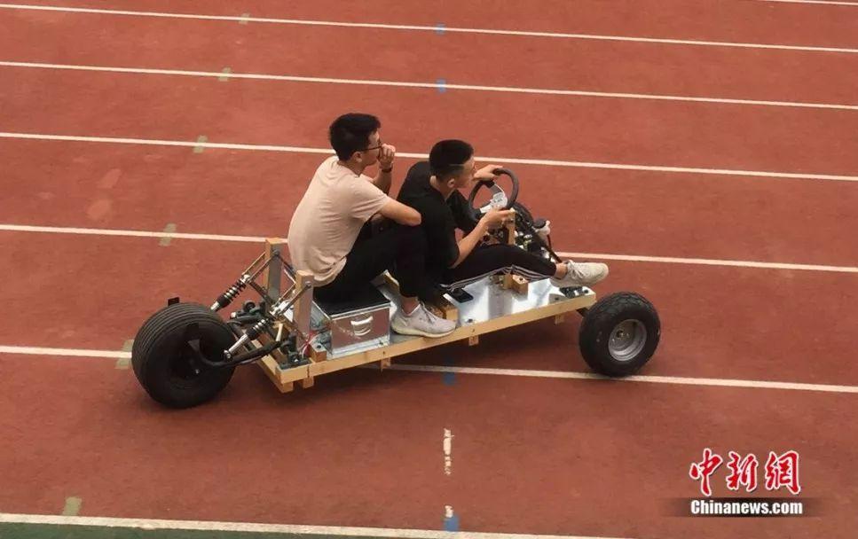 蒋皓开着自己制作的车在学校操场上试跑 受访者供图