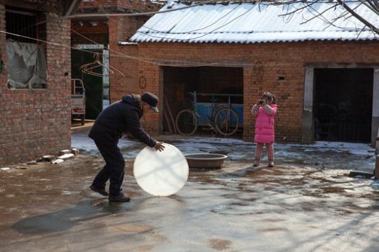 2018年12月28日,放在父亲家院子里大盆中的水结成冰,他拿出冰块想给外孙女玩,外孙女在旁边给他拍照。