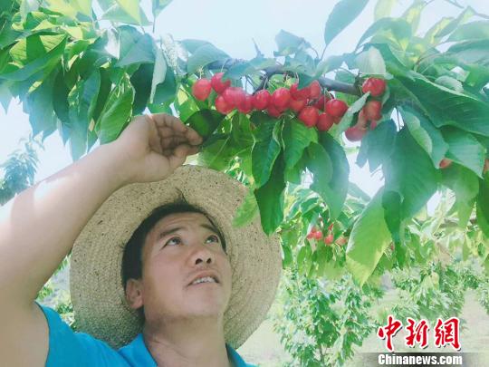 刘正红正在位于甘肃省镇原县南川乡金色阳光大樱桃采摘园里采摘樱桃。 张宁宁 摄