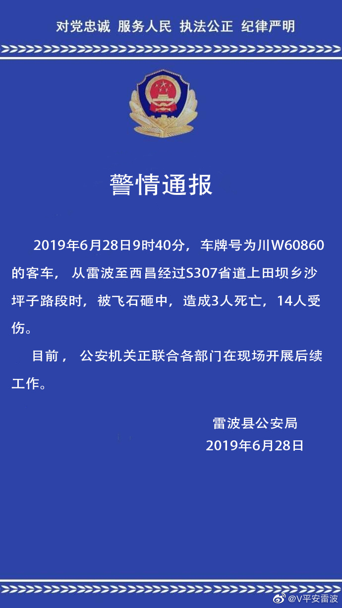 中新网6月28日电 据四川凉山雷波县公安局微博消息,6月28日9时40分,一辆车牌号为川W60860的客车,从雷波至西昌经过S307省道上田坝乡沙坪子路段时,被飞石砸中,造成3人死亡,14人受伤。