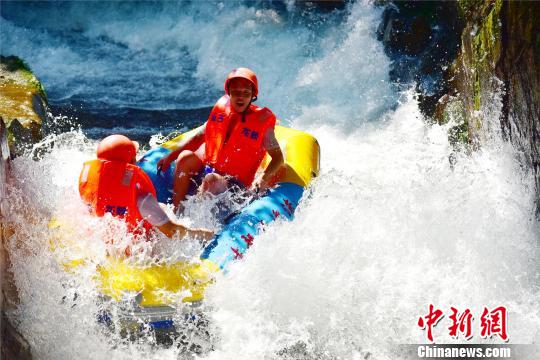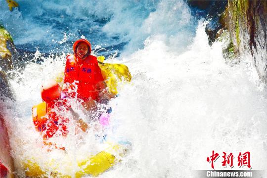 在全长6.1公里的漂流赛道上,河道两岸悬崖对峙,腾起的浪花拍打着岩石,翻滚咆哮的激流一会将橡皮艇抛向浪尖,一会儿又推入激流谷底。参赛选手们钻进了高高腾起的浪滔之中,瞬时又跌进另一道浪坎。激流拉出一道白色的长练,惊叫声在浪花中翻滚。