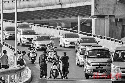 民警到场不久,就查获一名骑车违法上高架桥的女骑手,当场暂扣其所骑的电动车。由于车辆被扣,女骑手情绪比较激动。据了解,这名女子从闽侯骑着电动车来市区,为图方便,一路基本骑行在机动车道上,过了螺洲大桥后,又沿着南台大道闯上了北园高架桥,直到被民警发现拦下。在民警的开导下,她也认识到自己的错误。