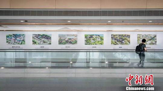 图为游客在扶梯上浏览手绘复原的慈云寺、李子坝、湖广会馆等重庆历史文化街区。重庆机场供图