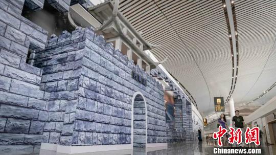 图为以木制工艺和泡沫雕塑的形式“复刻”到航站楼的合川钓鱼城。重庆机场供图