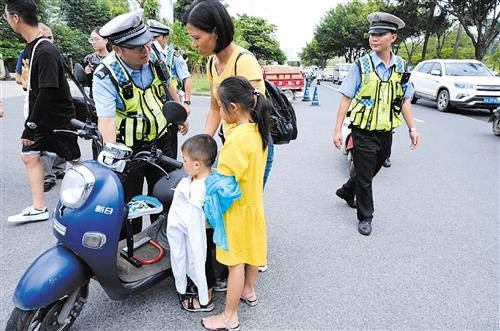 这边小王刚领了罚单离开,那边林女士又被拦下了,原来是她骑着电动自行车载着两名小孩行驶,此举非常危险。按照规定,电动自行车只允许搭载一名乘客,超载存在交通安全隐患,交警对林女士违法行为进行处罚后,协助其和孩子们安全离开。