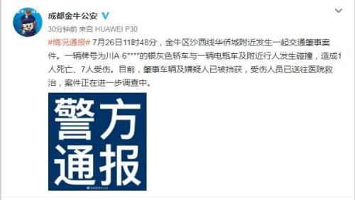 中新网7月26日电 成都市公安局金牛公安分局官方微博今日发布情况通报称,26日11时48分,金牛区沙西线华侨城附近发生一起交通肇事案件。一辆牌号为川A·6****的银灰色轿车与一辆电瓶车及附近行人发生碰撞,造成1人死亡、7人受伤。