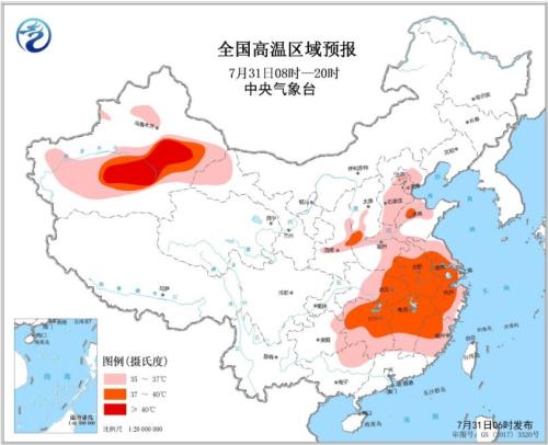 受副热带高压影响,预计7月31日白天,华北中东部和南部、关中平原、黄淮大部、江淮、江汉中东部、江南、华南北部、新疆南疆盆地等地,气温达35℃,其中,山东西北部、山西西南部、江淮、江汉东部、江南中北部、新疆南疆盆地等地的部分地区,气温达37~39℃,局地可达40℃以上。,气象台7月31日6时继续发布高温黄色预警。