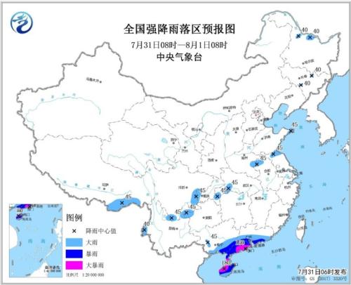 其中,7月31日8时至8月1日8时,广西东南部、广东中南部、海南岛有大到暴雨,其中,广东西部沿海、海南岛西北部等地的部分地区有大暴雨(100~180毫米)。另外,黑龙江北部、河南东部、苏皖北部、湖北西南部、云南西部和东北部、四川盆地东南部等局地有大雨。上述部分地区伴有短时强降水(小时降水量20~50毫米,局地可达60毫米以上),局地有雷暴大风等强对流天气。,气象台7月31日6时发布暴雨蓝色预警。