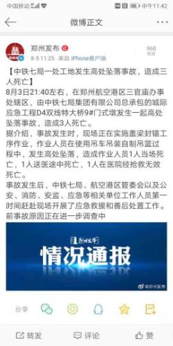 中新网郑州8月5日电(记者 刘鹏)来自郑州市委宣传部官方微博的消息称,8月3日21:40左右,在郑州航空港区三官庙办事处辖区,由中铁七局集团有限公司(以下简称中铁七局)总承包的城际应急工程D4双线特大桥9#门式墩发生一起高处坠落事故,造成3人遇难。
