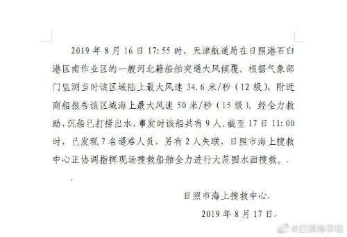 根据气象部门监测当时该区域陆上,风速34.6米/秒(12级),附近商船报告该区城海上,风速50米/秒(15级)。经全力救助,沉船已打捞出水,事发时该船共有9人。日照市海上搜救,正协调指挥现场搜救船舶全力进行大范围水面搜救。