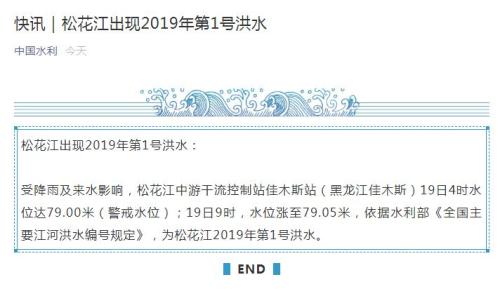 中新网8月19日电 据水利部官方微信公号消息,受降雨及来水影响,松花江中游干流控制站佳木斯站(黑龙江佳木斯)19日4时水位达79.00米(警戒水位);19日9时,水位涨至79.05米,依据水利部《全国主要江河洪水编号规定》,为松花江2019年第1号洪水。
