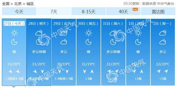 今天天空逐渐放晴,但是炎热也将回归。北京市气象台发布27日6时发布天气预报:今天白天晴间多云,早晨东部有轻雾或雾,北风2、3间4级,,气温33℃;夜间晴间多云,北风2级转3、4级,,气温20℃。