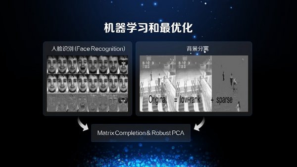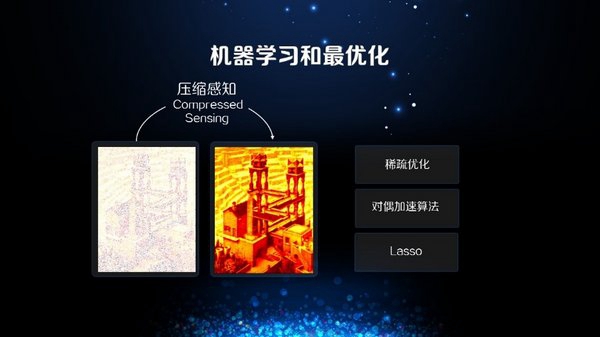 第一个应用叫压缩感知,首先我们把一个图去掉80%、90%的像素点,然后如何还原到原有的图片,这个问题看起来非常困难,但是在实际应用中,压缩感知的算法就有非常好的效果。与这个问题相关的,还有很多很优美的优化算法,比如稀疏优化,对偶加速算法、Lasso。