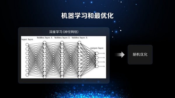 ,一部分是深度学习。深度学习有很多层神经网络,这个算法在97年就已经被提出来了,但是之所以最近才会有非常大规模的应用,因为在算法上会有非常大的提高,我们可以通过GPU来进行加速运算。另外,我们在优化算法上也有了非常好的进展。其相关的优化算法是随机优化,顾名思义,它不会优化所有的变量、所有的样本,而是随机挑选一个或者几个样本进行优化,然后在不需要看完整样本的情况下就可以有非常好的效果,可以大规模的提高模型训练速度。