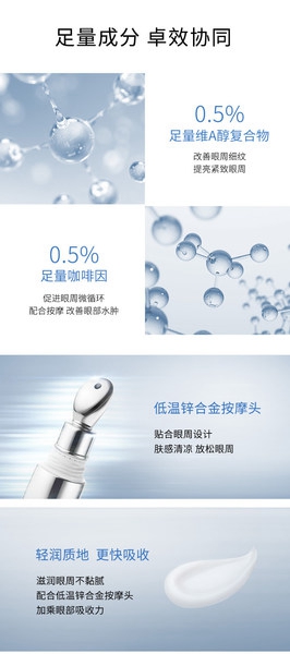 此款眼霜不仅在成分上做到了极优配比,在“硬件”上也是科技感满满。自带的低温锌合金金属按摩头,在解放双手的同时还能,限度满足哪里有纹点哪里,满足现代快节奏下广大消费者对于“一物多用”的护肤需求。