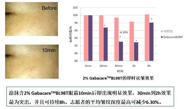 GABA的作用机制和肉毒素相似,也叫涂抹式肉毒素。经华熙生物研究院证实,2%的GABA涂抹眼周后10分钟后即可得到明显的改善细纹效果,且可持续起效8小时。BM肌活微电流眼霜中GABA的含量为3%,可在安全浓度之内达到更好地改善细纹的效果。