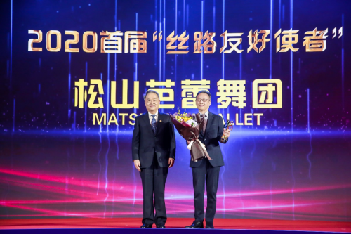全国政协副主席、交通运输部党组书记、中国国际文化交流中心理事长杨传堂为“丝路友好使者”获奖团体松山芭蕾舞团颁奖