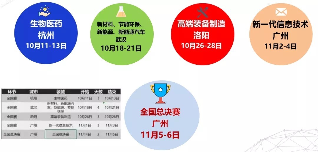1.熟悉了解赛制规则和赛程日期熟悉了解赛制规则,更有利于有效规划自己的项目介绍材料以及进行赛事准备。特别需要重视赛程日期安排,确保赛事当天能够顺利参加比赛。今年的国赛,分为7大行业,以“4+1”的形式进行。
