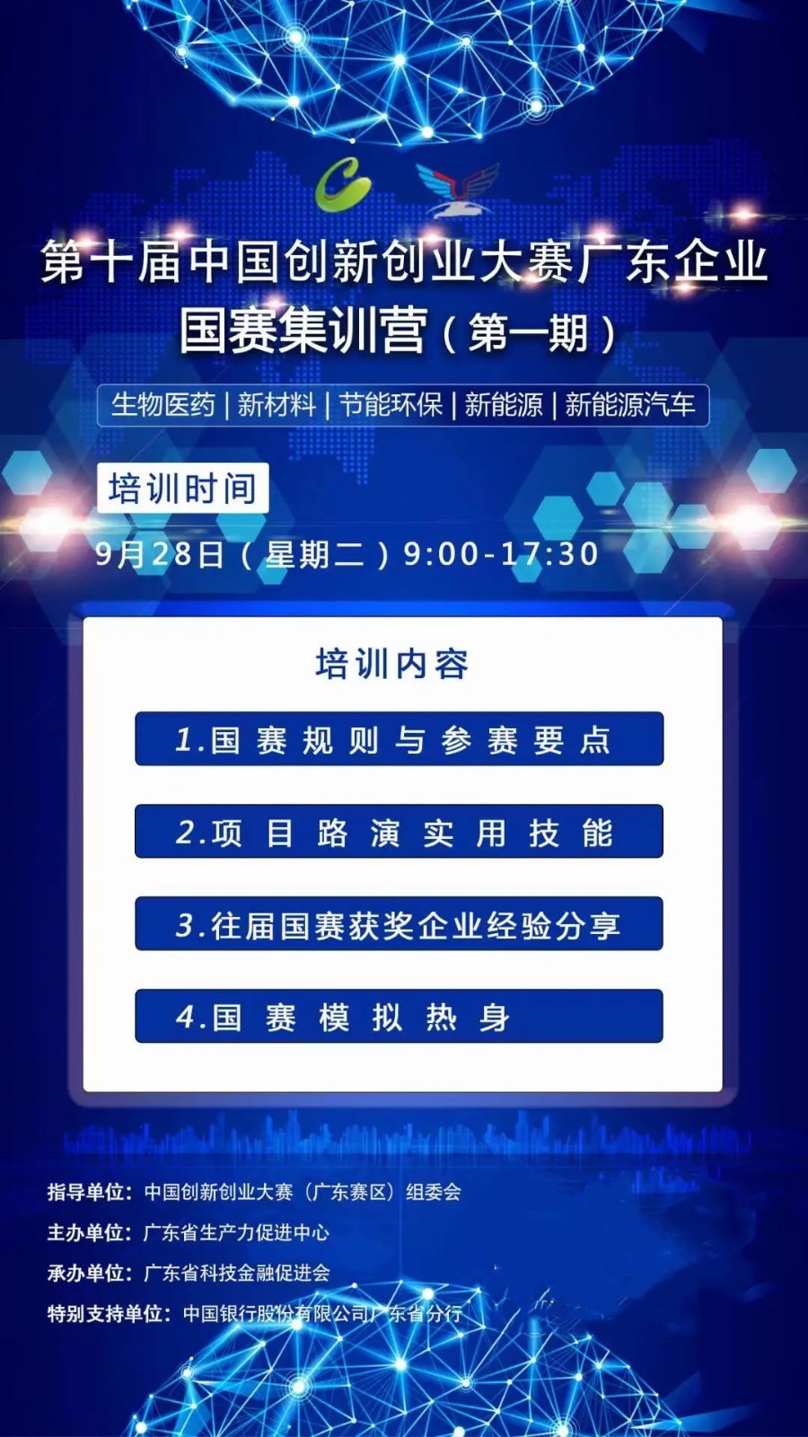 生物医药、新材料、节能环保、新能源、新能源汽车等5大行业推荐参加国赛的广东企业则通过视频直播及腾讯会议参加培训。