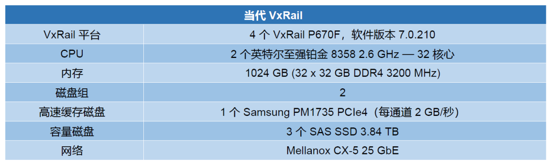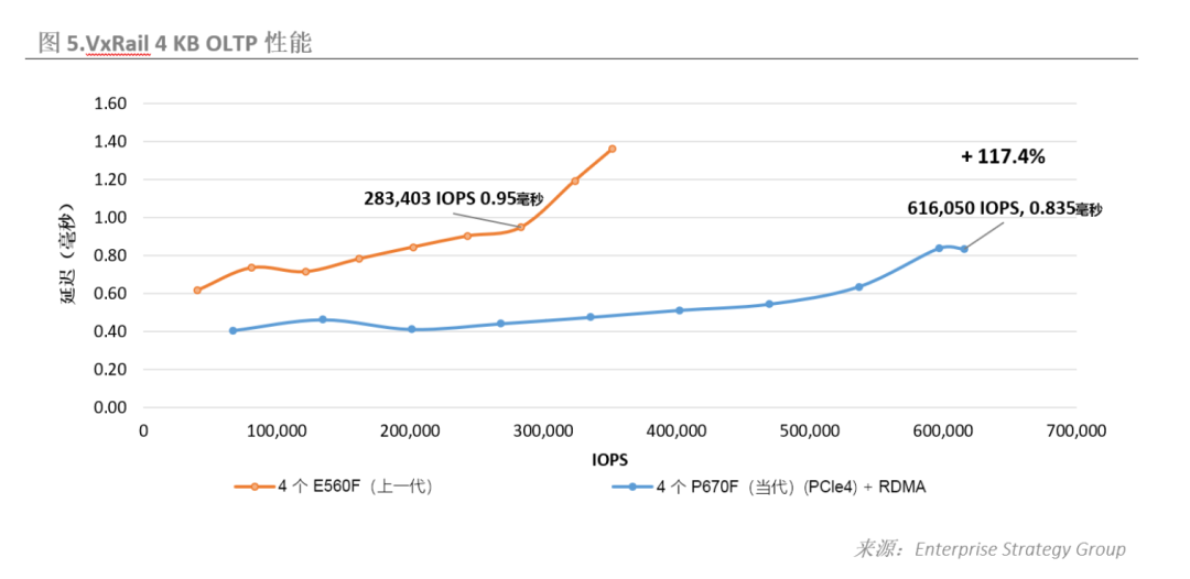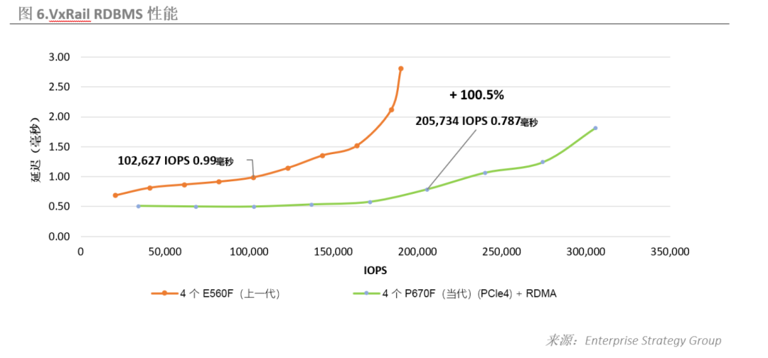 ESG在搭建的测试环境中,选择了当代VxRail(P670F)与运行在上一代 PowerEdge服务器上的VxRail(E560F)进行比较。