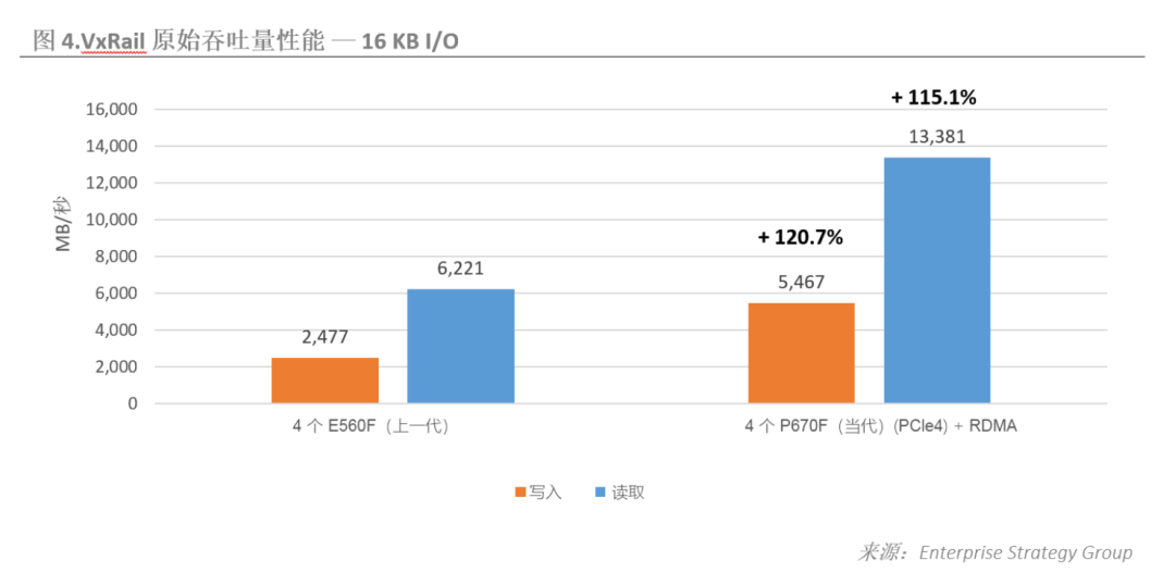可以看到,新一代VxRail的IOPS性能水平与上一代相比有了显著提升,写入 IOPS 增加54.4%,读取IOPS增加114.7%。
