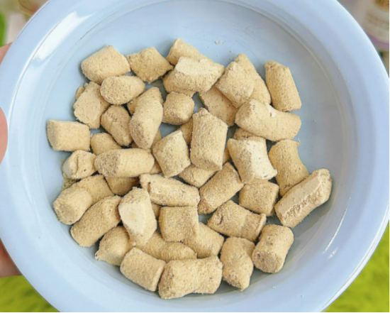 再说说肉的新鲜度,麦富迪和凤祥是签约合作的,鲜肉厂对厂直送,全程0-4℃冷链运输,真正做到了“冷鲜直达”。再加上麦富迪他们家有自己的冻干仓,品控特别严,用的是FD冻干技术,-36℃极速冷冻,把肉里的营养和味道都“锁”住了。打开袋子就能闻到一股淡淡的肉香,不是那种刺鼻的腥味,冻干颗粒干爽疏松,不油不粘,小猫嚼起来也轻松。