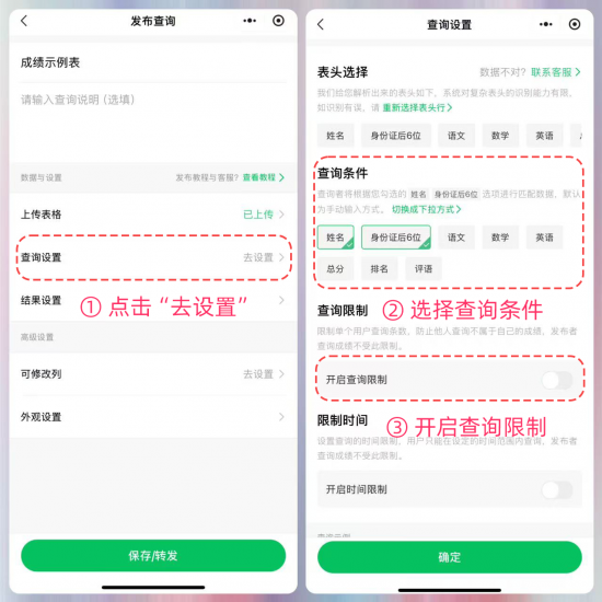 选择姓名和身份证后6位(如有)作为查询条件,开启查询限制,限制一个微信只能查询1条成绩记录,避免家长乱查。