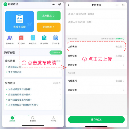 完善基础信息,点击保存/转发按钮即可发布成绩。成绩查询页面点击【分享/转发】按钮,可将成绩查询页面转发给家长。