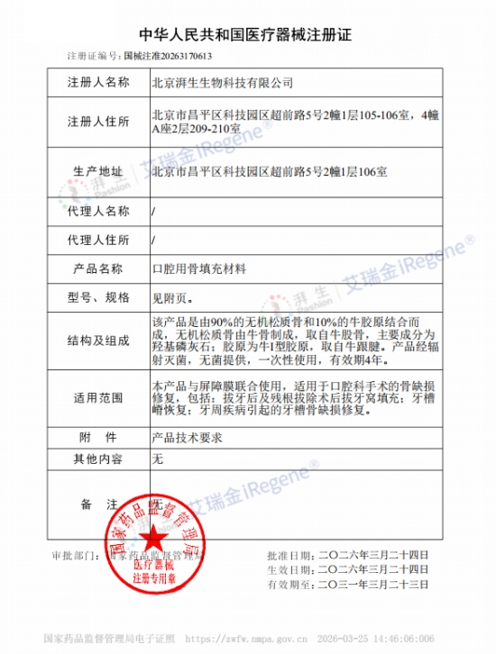 近日消息,国家药品监督管理局(NMPA)正式批准由北京湃生生物科技有限公司(以下简称“北京湃生”)自主研发的口腔用骨填充材料第Ⅲ类医疗器械注册申请,产品获发国家Ⅲ类医疗器械注册证(注册证号:国械注准20263170613)。